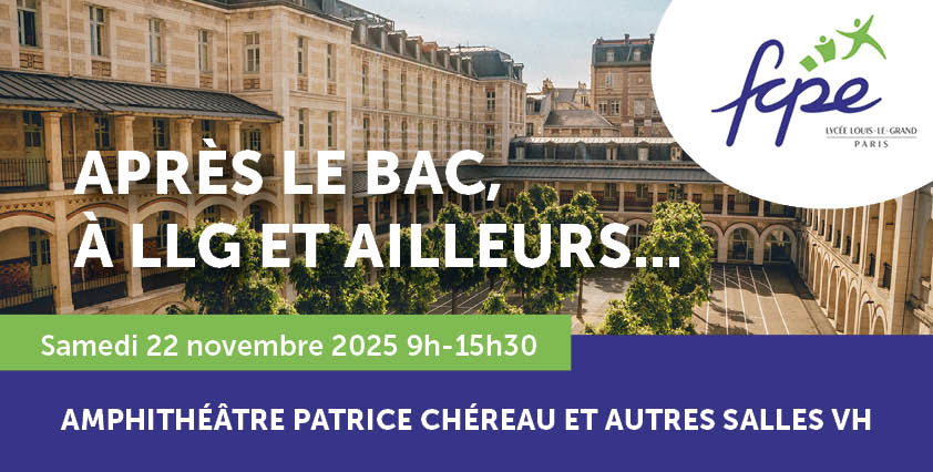 SAMEDI 22 NOVEMBRE 2025 – 9h – 15h Chers parents, L’équipe de la FCPE-LLG est heureuse de vous inviter le samedi 22 novembre à partir de 9h à la 19e édition de la journée « Après le bac, à LLG et ailleurs », qui ouvre la série de nos réunions d’information et d’orientation vers les études supérieures. Ce premier rendez-vous a pour but de vous informer sur les principales filières offertes aux lycéens. Nous proposons également aux parents et élèves de 1ère qui le ....