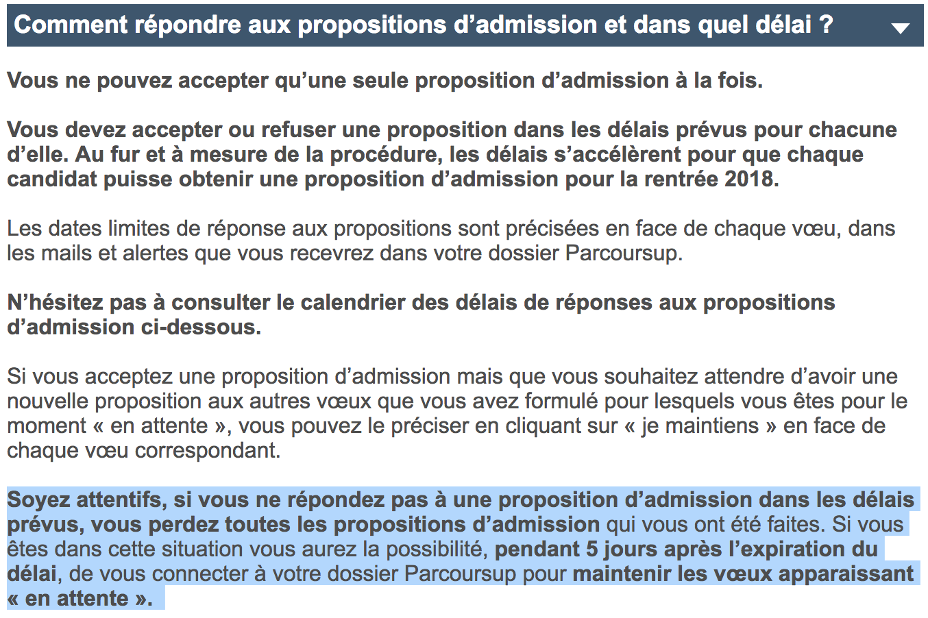 Nous attirons en particulier votre attention sur le paragraphe suivant, de l’onglet « Comment répondre aux propositions d’admission et dans quel délai ? » : « Soyez attentifs si vous ne répondez pas à une proposition d’admission dans les délais prévus, vous perdez toutes les propositions d’admission qui vous ont été faites. Si vous êtes dans cette situation vous aurez la possibilité, pendant 5 jours après l’expiration du délai, de vous connecter à votre dossier Parcoursup pour maintenir les vœux apparaissant « en attente ».