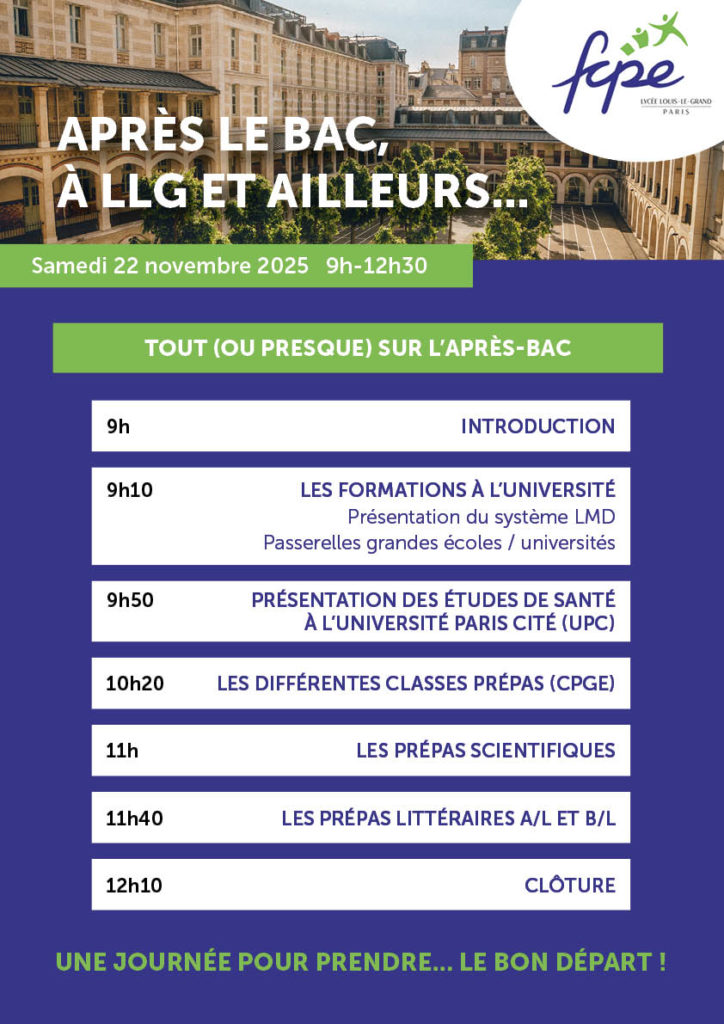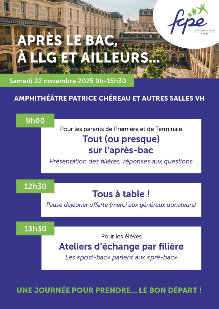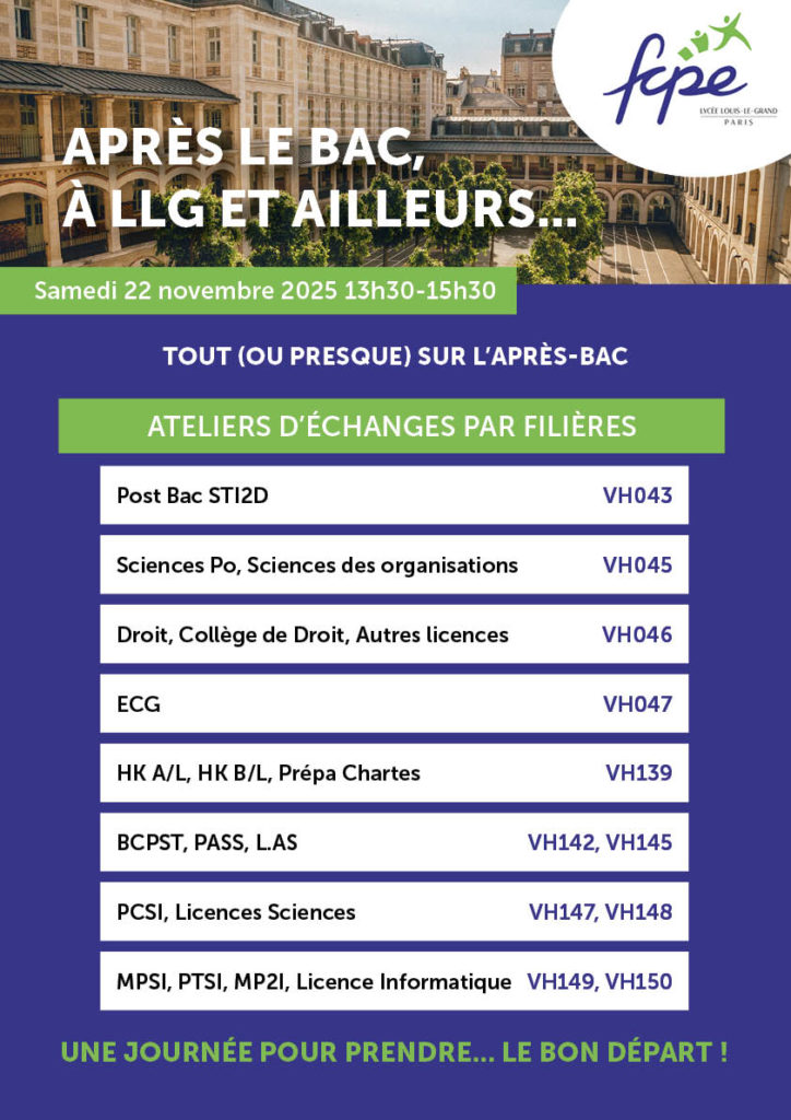 L’équipe de la FCPE-LLG est heureuse de vous inviter le samedi 22 novembre à partir de 9h à la 19e édition de la journée « Après le bac, à LLG et ailleurs », qui ouvre la série de nos réunions d’information et d’orientation vers les études supérieures.